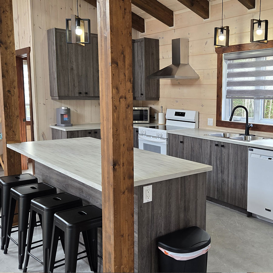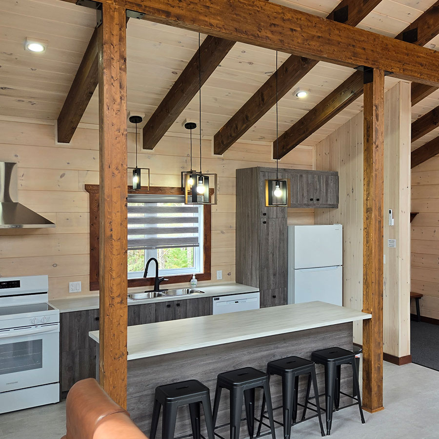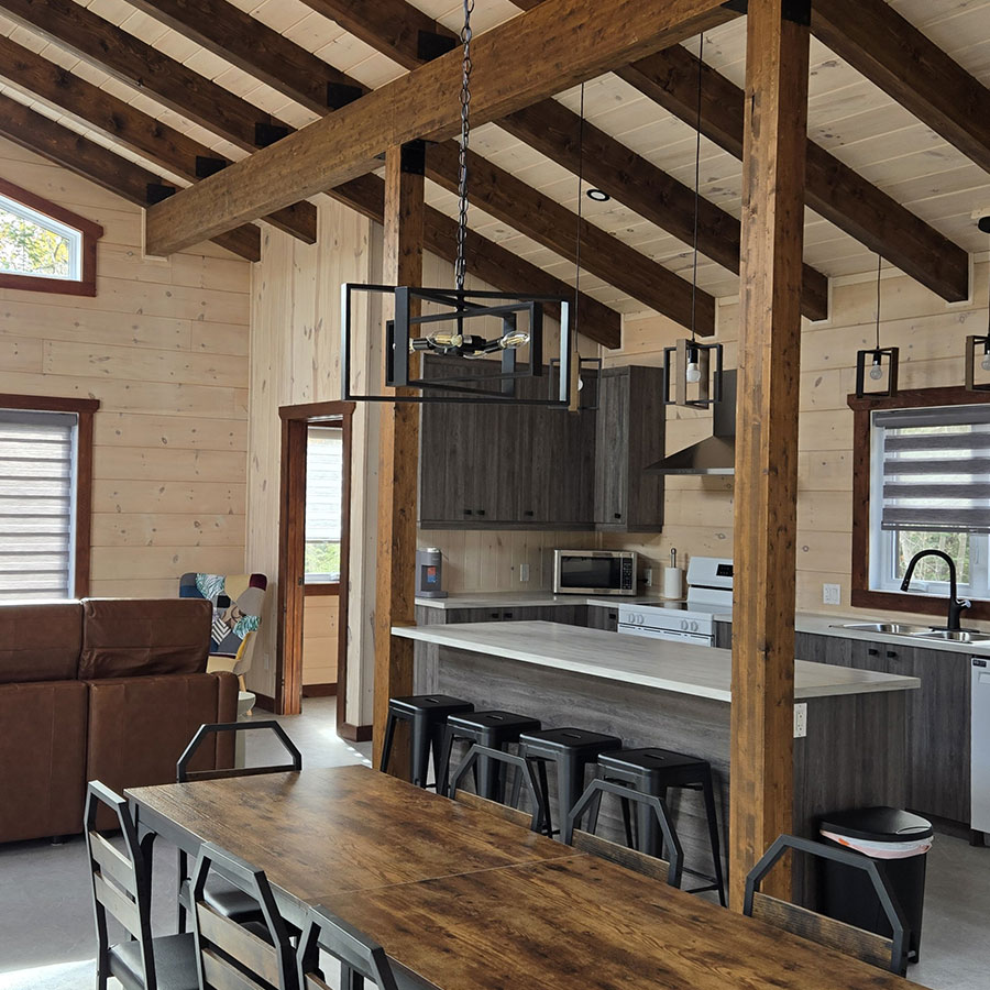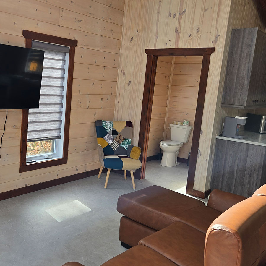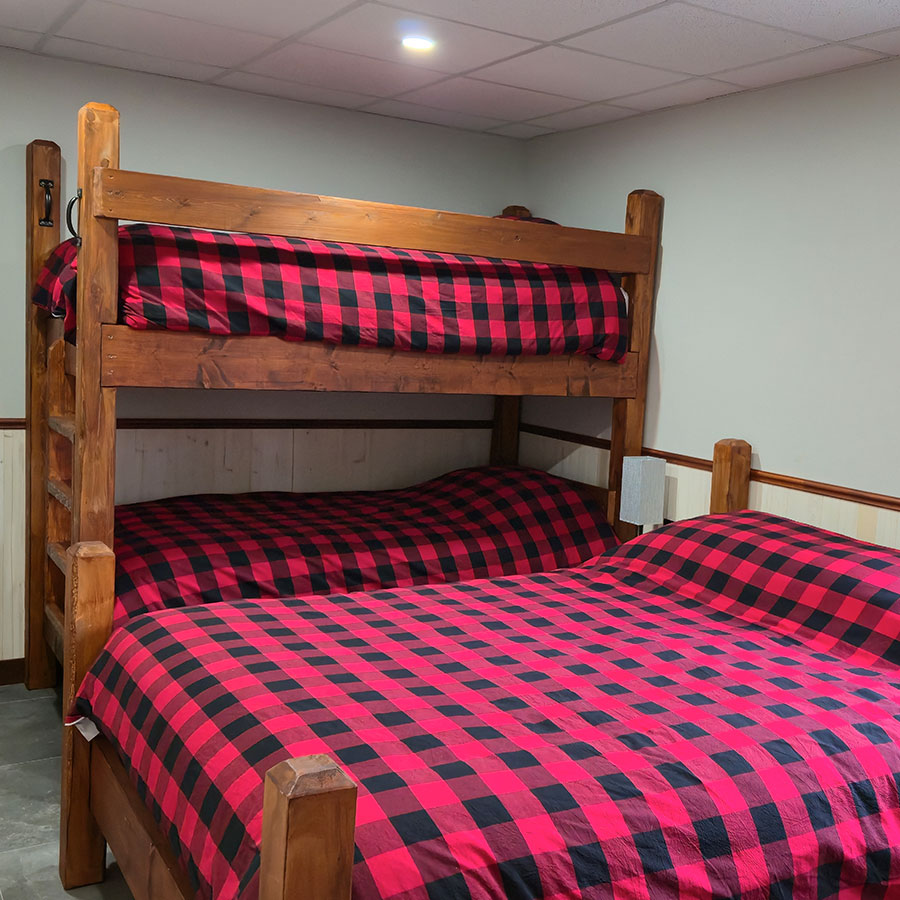 • Chambre #1 : 1 lit queen, 2 lits simples superposés et une salle de bain privée (douche)